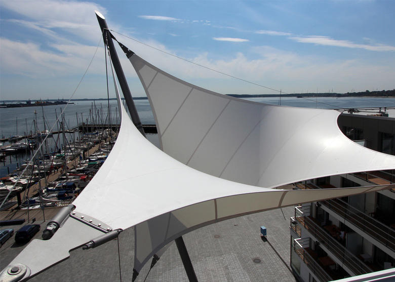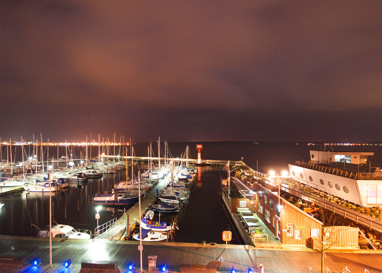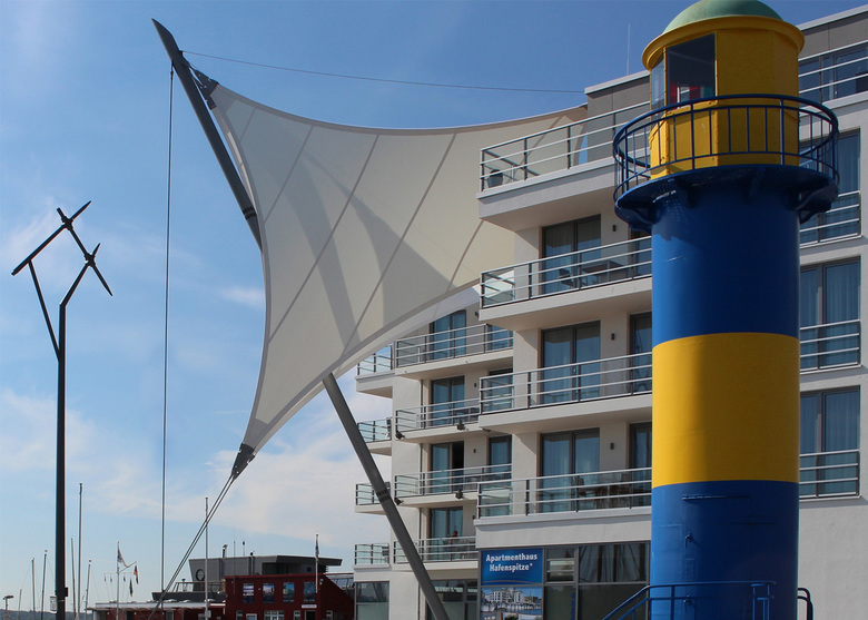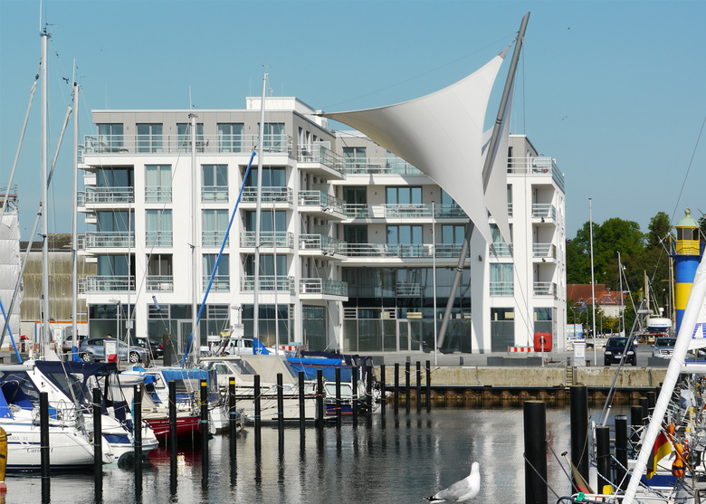 Der Platz zwischen Apartmenthaus und Hafen hat durch das darüber aufgespannte Segel ein besonderes Ambiente und kann wegen der Abschirmung der Nachbarbebauung als Ort für laute Musikveranstaltungen genutzt werden. Durch die besondere Konstruktion der vorgelagerten Balkone mit verglasten Schiffsgeländern sowie besonders ausgebildeten Fassaden wird der Schall auch vom Inneren abgehalten.