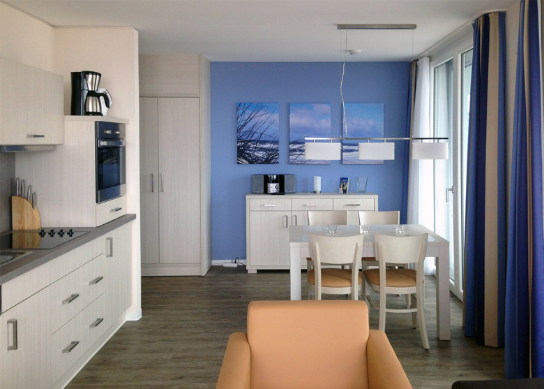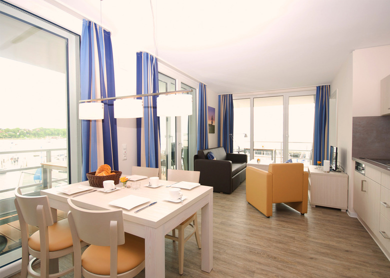 In drei Obergeschossen und einem Staffelgeschoss sind moderne Ferienapartments verschiedener Größe mit Orientierung zum Wasser und der Altstadt entstanden, die über große, vorgelagerte Balkone verfügen.