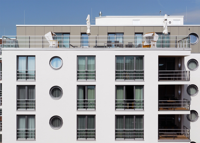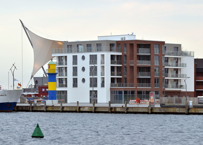 Die Kombination von hellen Putzflächen, Klinkern am Sockel- und Teilbereichen der Fassade sowie großzügig verglasten Apartments mit den vorgelagerten Balkonen gibt dem Gebäude ein elegantes maritimes Äußeres.