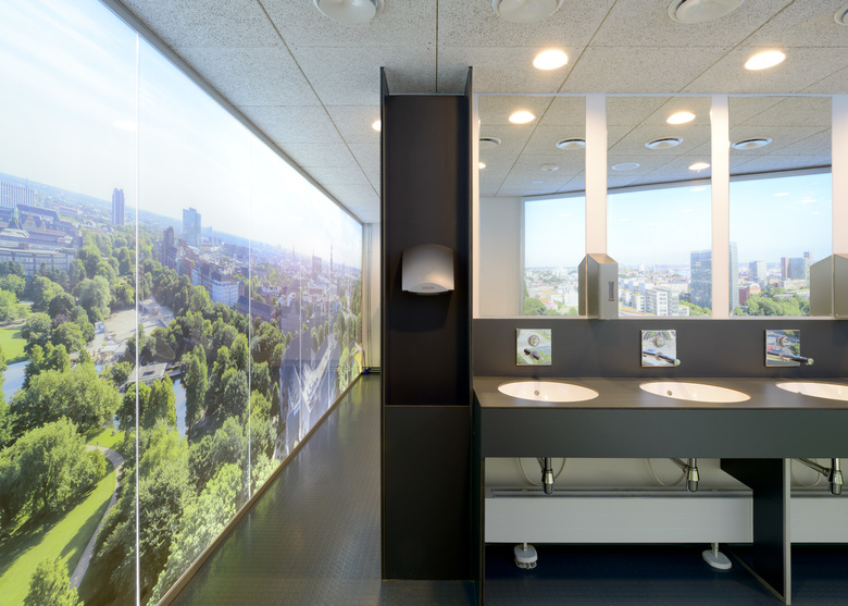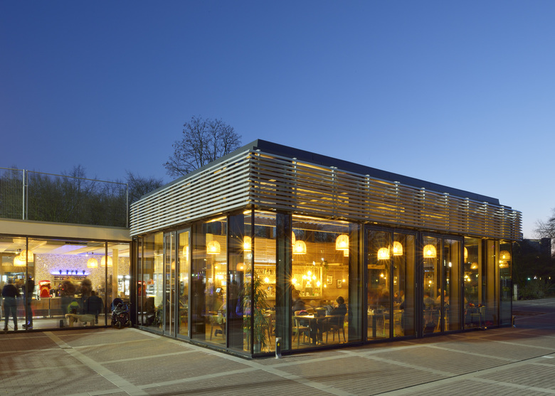 Nach Überarbeitung des Entwurfes durch rimpf Architektur wurde das Café höhengleich an die Eisbahn angeschlossen und damit ohne Hilfsmittel barrierefrei an die Anlage angeschlossen. Die zentralen Sanitärbereiche wurden komplett neu konzipiert und mit selbstleuchtenden Bildwänden mit Motiven aus Planten und Blomen zum besonderen Highlight.