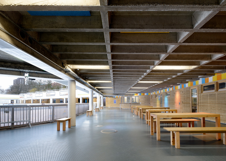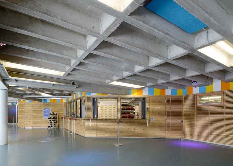 Die vorherige Deckenverkleidung mit Holzleisten wurde entfernt um den gedrungenen Eindruck der Anlage abzumindern. Die vorhandenen Beton- Rippendecken wurden saniert und sichtbar belassen.