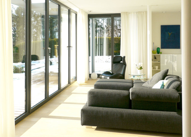 Die bauliche Umsetzung geschah mit hochwertigen Materialien und im modernen EnEv-Standard. Wie bei der Außenhaut, die nur aus den Materialien Putz und feingegliederte Aluminiumprofilen besteht, ist auch die Architektur im Inneren auf wenige stilprägende Materialien beschränkt.