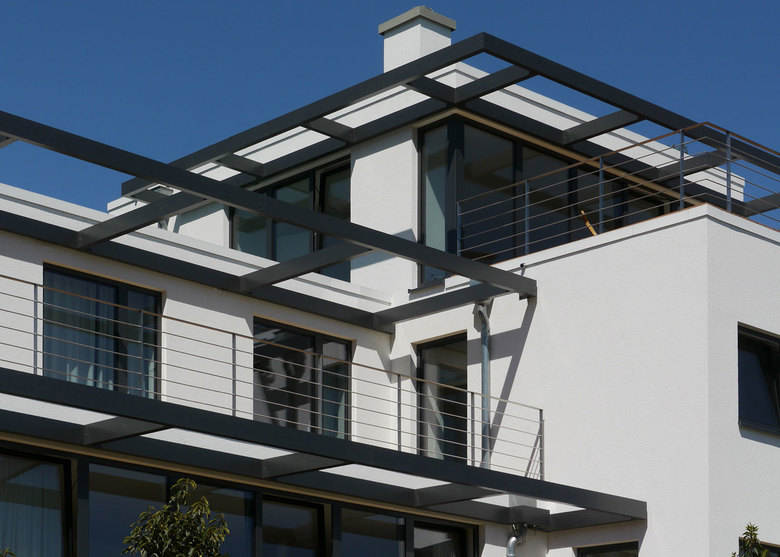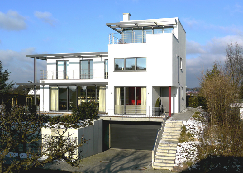 Die klaren Formen in Kombination mit der schlicht gehaltenen weißen Putzfassade unterstreichen die Architektur des Gebäudes als moderne Interpretation der Bauhaustradition. Die vorgelagerten Rahmen, die zum Teil auch als Sonnenschutz fungieren, lassen das Haus mit seinen kubischen Formen leicht erscheinen und vervollständigen die Kubatur der Außenhülle.