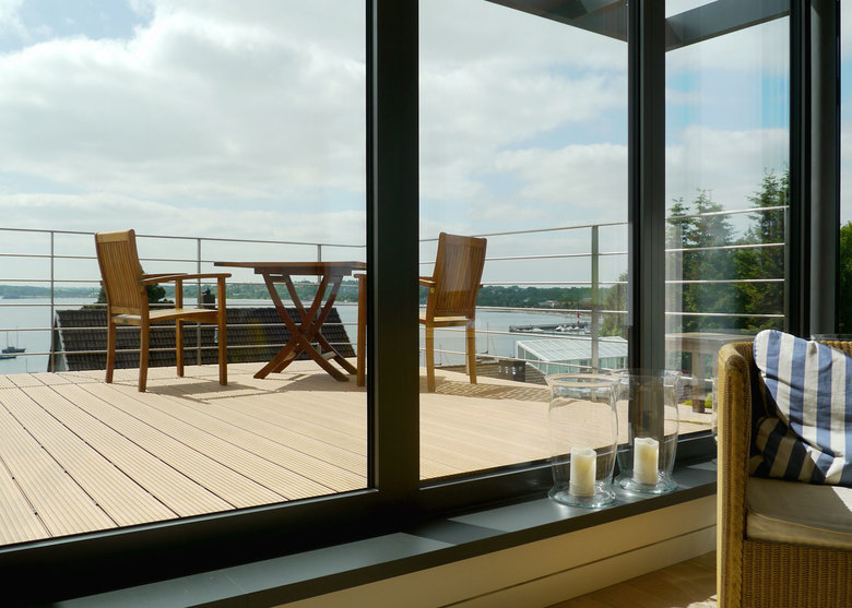Von verschiedenen Decks auf allen Ebenen kann ein phänomenaler Blick auf die Eckernförder Bucht, die Stadt und die herrliche Umgebungslandschaft genossen werden. Die Außenansicht ist geprägt von den übereinander angeordneten großzügigen Decks, wodurch funktional eine Verzahnung zwischen Außenraum und Innenraum entsteht.