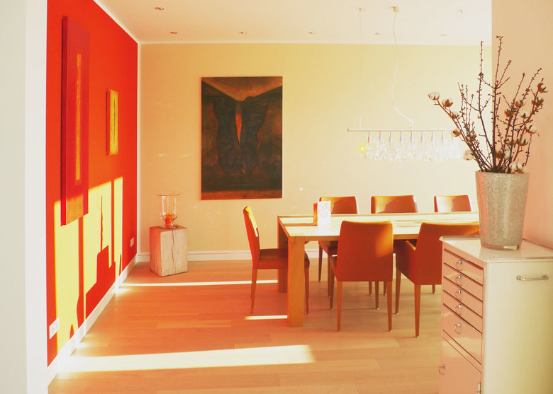 In den, ebenso wie die Decken, weiß geputzten Wände sind Türen und Fußleisten flächenbündig integriert. Lediglich wenige Wände sind zur gestalterischen Akzentuierung farbig lasiert. Für die Fußböden wurden durchgängige Eichendielen verwendet, die sich in den Treppenstufen fortsetzen. Auch hier wurde die gradlinige Architektur mit Trittstufen und Handlauf aus geschliffener Eiche umgesetzt.