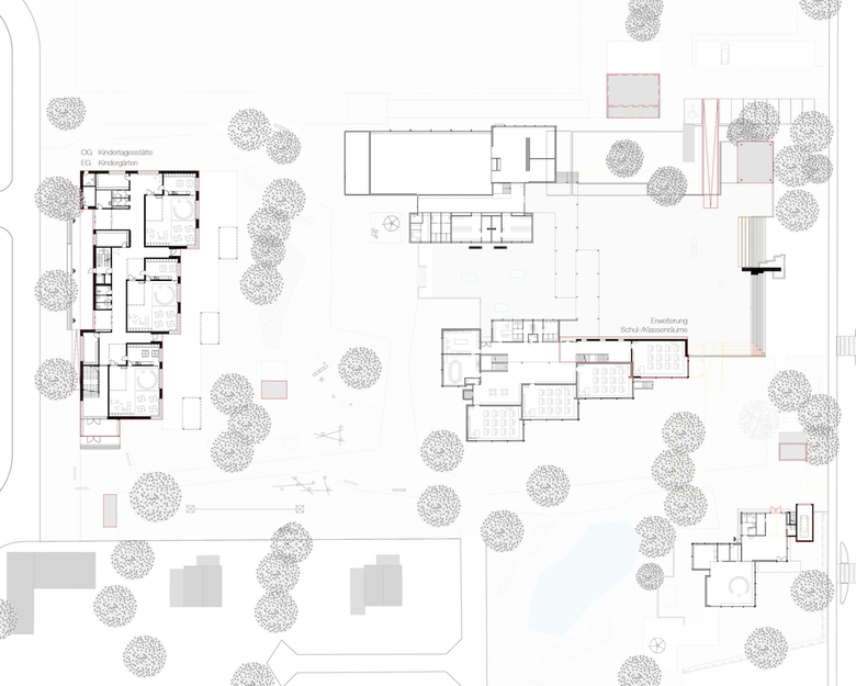 Für die zusätzlichen Kindergärten und die Kindertagesstätte wird ein gemeinsamer Neubau vorgeschlagen, welcher durch die Setzung an die westliche Grenze des Perimeters grosszügige Aussenräume für die ganze Schulanlage belässt. Das neue Volumen schliesst die Anlage zur Kerbelstrasse hin ab und verleiht ihr ein neues Gesicht. Die neuen Gebäude werden mit einer Klinkerfassade analog der bestehenden Anlage weitergeführt.
