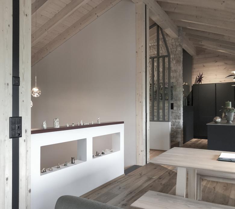 Aufgesattelt auf einem Sockel in Massivbau liegt ein langgezogener Holzbau, gegliedert in einen offenen Wohnteil und einen Remisenteil (Garage). Das Gebäude ist im Hang gestaffelt - es ergeben sich Abstufungen, welche unter Anderem als Swimmingpool genutzt werden.