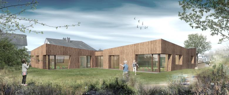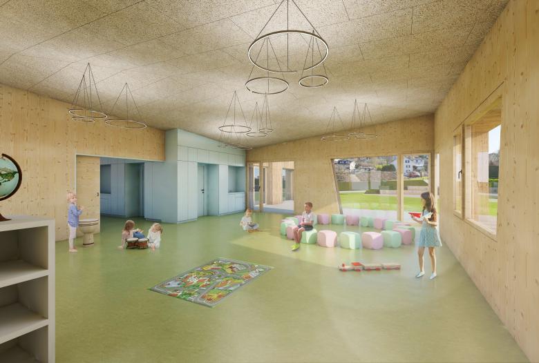 Das Grundstück liegt abseits der Hauptverkehrsachsen, in naher Gehdistanz zur Schulanlage. Ein neuer Fussweg wird den Kindergarten mit dem Dorfzentrum verbinden. Die zwei Baukörper sind parallel zum Hang gesetzt und verschieben sich entlang des Zwischenbaus. Jeder Baukörper bildet einen Kindergarten. Die Erschliessung aller Räume erfolgt über den Zwischenbau. Die Verschiebung erlaubt es, auf die morgendliche Nutzung zu reagieren. Die Orientierung parallel zum Hang erlaubt das Definieren von Aussenräumen vor und hinter dem Haus. Dies gibt den Gruppen die Möglichkeit, sich ohne gegenseitige Ablenkung, unabhängig voneinander, im Freien zu bewegen.