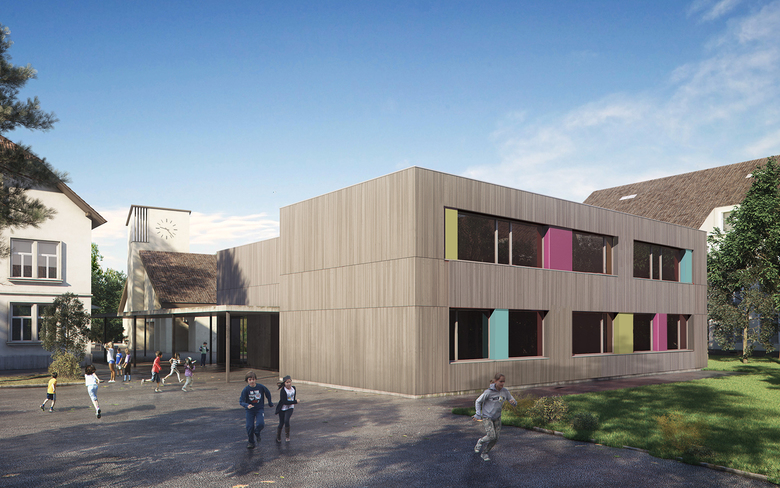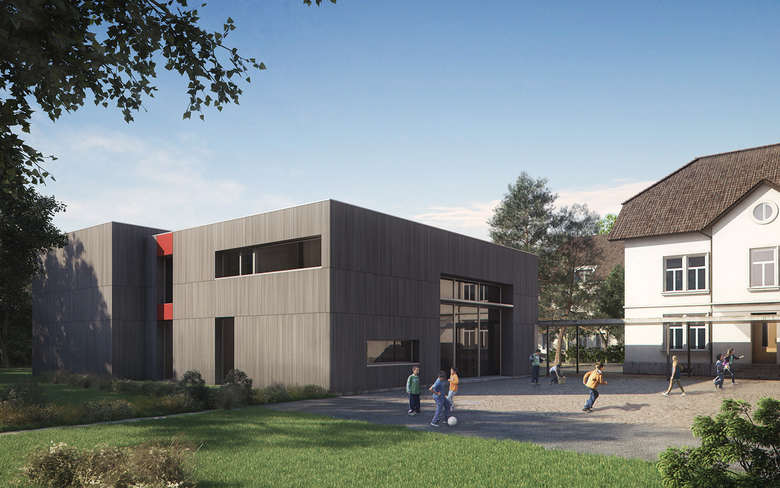 Ein exakt gesetzter neuer zweigeschossiger Körper ersetzt das bestehende Schulhaus aus den 60-er Jahren.