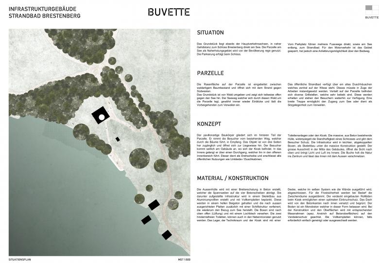 Der pavillonartige Baukörper gliedert sich im hinteren Teil der Parzelle. Er nimmt die Besucher vom bestehenden Weg, welcher durch die Bäume führt, in Empfang. Das Objekt ist von drei Seiten her zugänglich und öffnet sich zur Liegewiese hin. Der Besucher kommt seitlich am Gebäude an, wo sich der Kiosk befindet. In das Innere gelangt er über einen Durchgang, welcher ihn in den offenen Innenbereich führt. Dieser dient als Drehscheibe und erschliesst alle öffentlichen Nutzungen wie Umkleide-/ Duschkabinen, Toilettenanlagen oder den Kiosk. Die massive, aus Beton bestehende Hülle, widerspiegelt die Standhaftigkeit eines Schlosses und gibt dem Besucher Schutz. Die Infrastruktur wird in leichten, abgekoppelten Boxen, als Skelettbau unter die massive Konstruktion gestellt. Der grosse Ausschnitt in der Mitte des Gebäudes, öffnet die Sicht nach oben und bringt Licht und Luft ins Innere. Die Buche holt die Natur ins Zentrum und lässt das Innen mit dem Aussen verschmelzen.