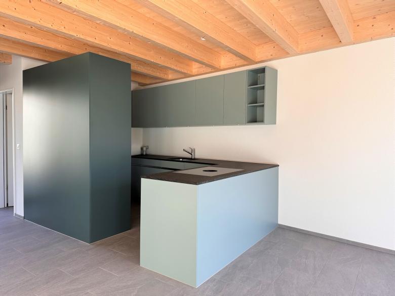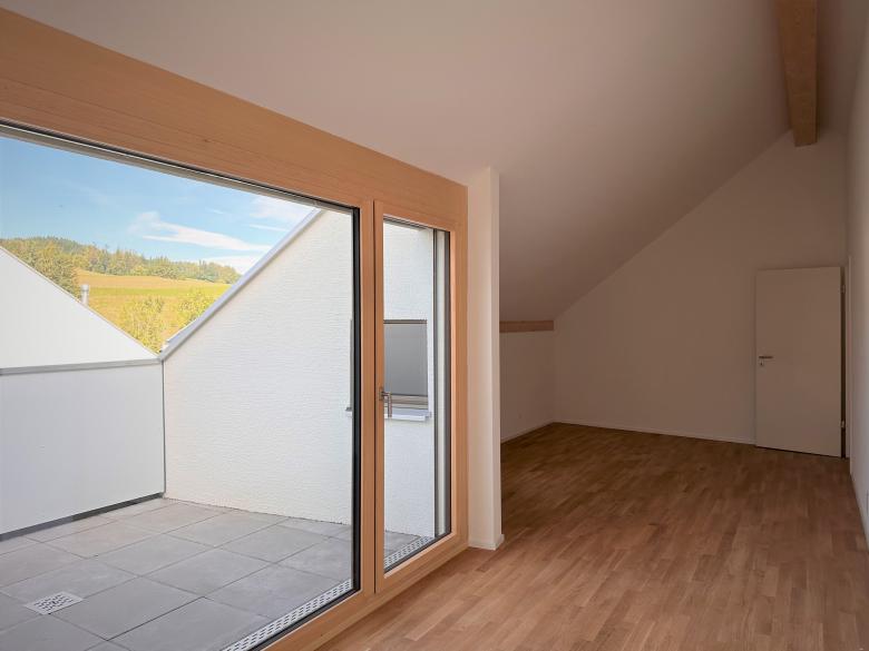 Bei diesem Objekt handelt es sich um drei Gebäude mit je drei Wohneinheiten. Viele Bauernhäuser zeichnen sich durch das Wechselspiel der Materialien - Ökonomieteil (Holz) und Wohnteil (Mauerwerk) - aus. Mit dieser Materialkombination wollte man im architektonischen Ausdruck dem Standort und der Geschichte der Gemeinde, Rechnung tragen. Auch der Grundriss zeichnet sich nicht als Rechteck aus und nimmt Bezug auf die vom Alter gezeichneten windschiefen Bauernhäuser. Das Wechselspiel zeigt sich ausserdem im Innenausbau mit Betondecken und Feinsteinzeugbelägen versus Holzbalkendecken und Parkettböden. Die Sichtelementbetontreppen nehmen Bezug auf den in früheren Zeiten verbauten Sandstein und ist natürlich auch dem Auftraggeber geschuldet. Der Grundriss mit den gespiegelten Trapezen ermöglicht es, die Flächen dort grösser zu gestalten, wo diese gebraucht werden.