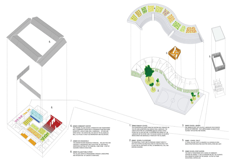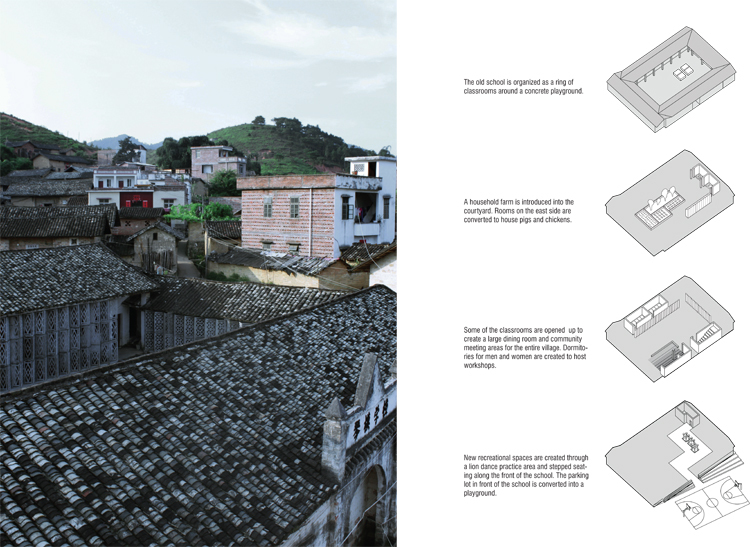 Today the full scope of the work involves 7 different projects which are funded individually by charitable organizations from Hong Kong. Every building project is coupled with a program initiative that emphasizes the education of villagers, whether it is through a school roof garden as an alternative teaching facility or the demonstration eco-household farm. Most importantly by improving on what and how to farm, the economic viability of the villagers can be strengthened. The failure of the farm system forces the young and able-bodied to migrate to cities, finding alternative ways to make a living as migrant laborers. Only the elderly and children remain in most villages. Not only has the concept of a rural livelihood been eroded, the entire social structure is at risk. The project seeks to re-build the notion of the village as a community and to reinforce the idea that education is the primary tool for sustainable development. The designs of the various projects are themselves adapted from and ‘learn’ from the existing typologies and construction methods of rural China. Simple variations in the use of concrete screen or brick work, the adaptation to existing landscape conditions and the re-programming of outdated buildings all inform on the generic conditions of design in rural China. To this day the project continues to involve students, professionals and organizations from China and Hong Kong together in a coordinated effort to explore and find new solutions to the way in which rural transformation can happen.