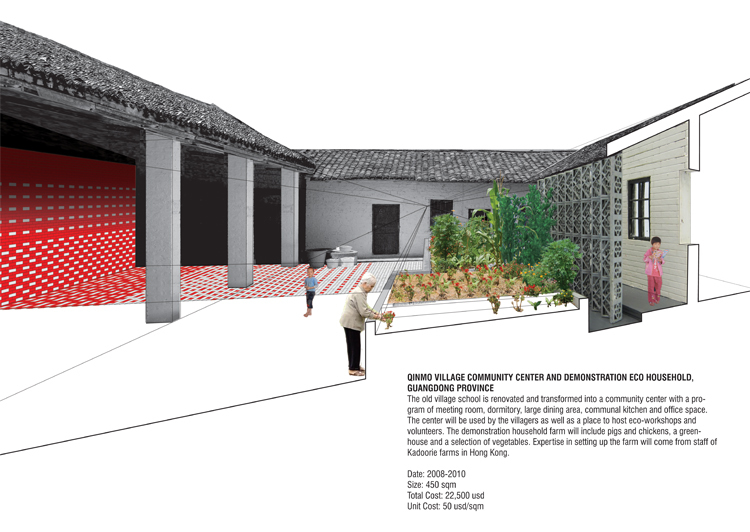 Qinmo Village Project is aimed at the long-term sustainable development of a rural Chinese village. The village itself traces its history back 300 years. However as a typical village in China, it is facing massive development and new 3-4 story concrete and tile buildings. Located in Huaji County at the western border of Guangdong Province, the area is one of the poorest in China, with yearly earnings as low as 200 USD yet only 6 hours drive from Hong Kong. The project goes beyond mere building construction by integrating educational programs and sustainable concepts. The construction project involves two buildings, the Qinmo Primary School and the Qinmo Community Center. The first is a new school designed to blend into the village landscape. The second is a project to renovate the old courtyard school building into a community center and demonstration eco household farm.