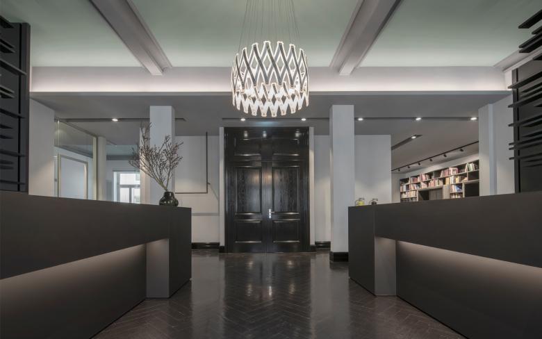 Die wenigen erhalten gebliebenen Stilmerkmale des historischen Innenausbaus haben wir hervorgehoben, indem wir ihren ursprünglichen Farbton verfremdet haben. Das alte Eichenholzparkett ist nun schwarz lackiert und die Deckenflächen zwischen den verkleideten Deckenbalken sind in einem kühlen Grüngrau gestrichen. Dies ist zugleich der einzige bauliche Farbakzent in den Räumlichkeiten von NORDISK BÜRO. Die schweren Damastvorhänge vor den Fenstern zur Kaiserstraße haben einen Nerzfarbton, der sich aufgehellt in dem Farbton der Deckenbalken wiederfindet. Die kubischen Thekenmöbel im Eingangsbereich sind aus schwarzem Fenix gefertigt. Die Perfektion dieser matten, kratzfesten Möbel-Oberfläche erzeugt einen spannungsvollen Materialkontrast auf dem glänzenden Holzboden mit all seinen überlackierten Dellen und Kerben.