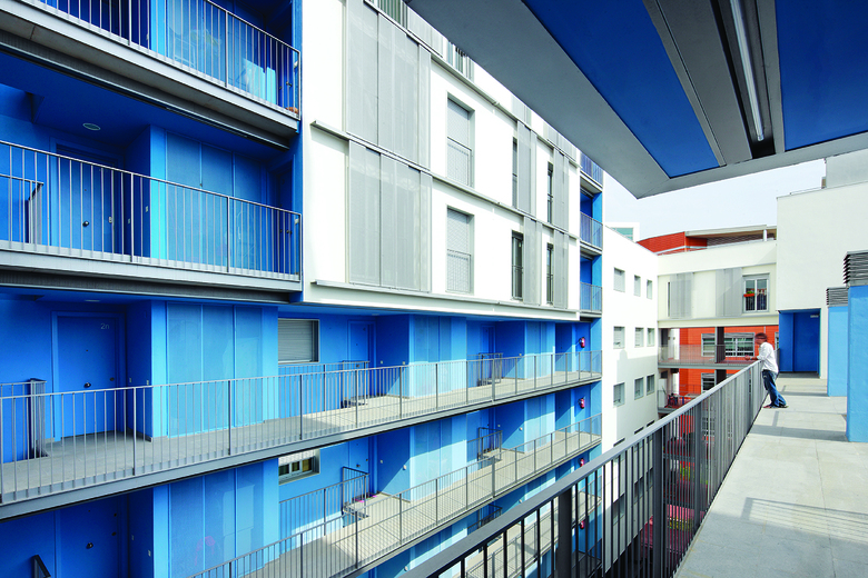 Chromatism: The situation of the building in the lot, in the corner of the island, and the relation that it establishes with the public space that crosses the island gives to this site a character attractive and singular.The definition of the volumes and the colors of the project are died to this urban situation and to its internal special organization.