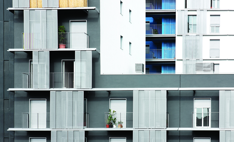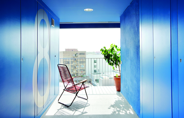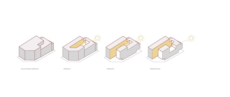 Volumetric arrangement: Three main operations of subtraction were set for all the dwellings to enjoy a minimum of 3h of direct solar radiation every day: a central void, the removal of the corner and the partial shortening of three levels at the Almogavers Street side.