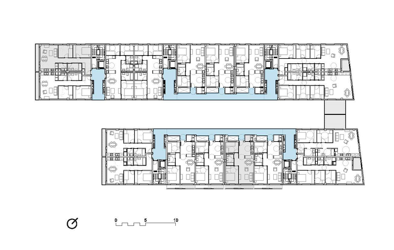 Organization: The central court is the main area to access retail, cores of stairs and the public space through the freed corner. The main building is organized with 5 cores that are connected with elevated pathways in the lower levels and that become independent on the top ones organizing the different typologies of dwellings.