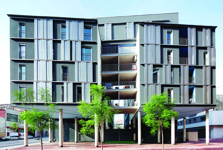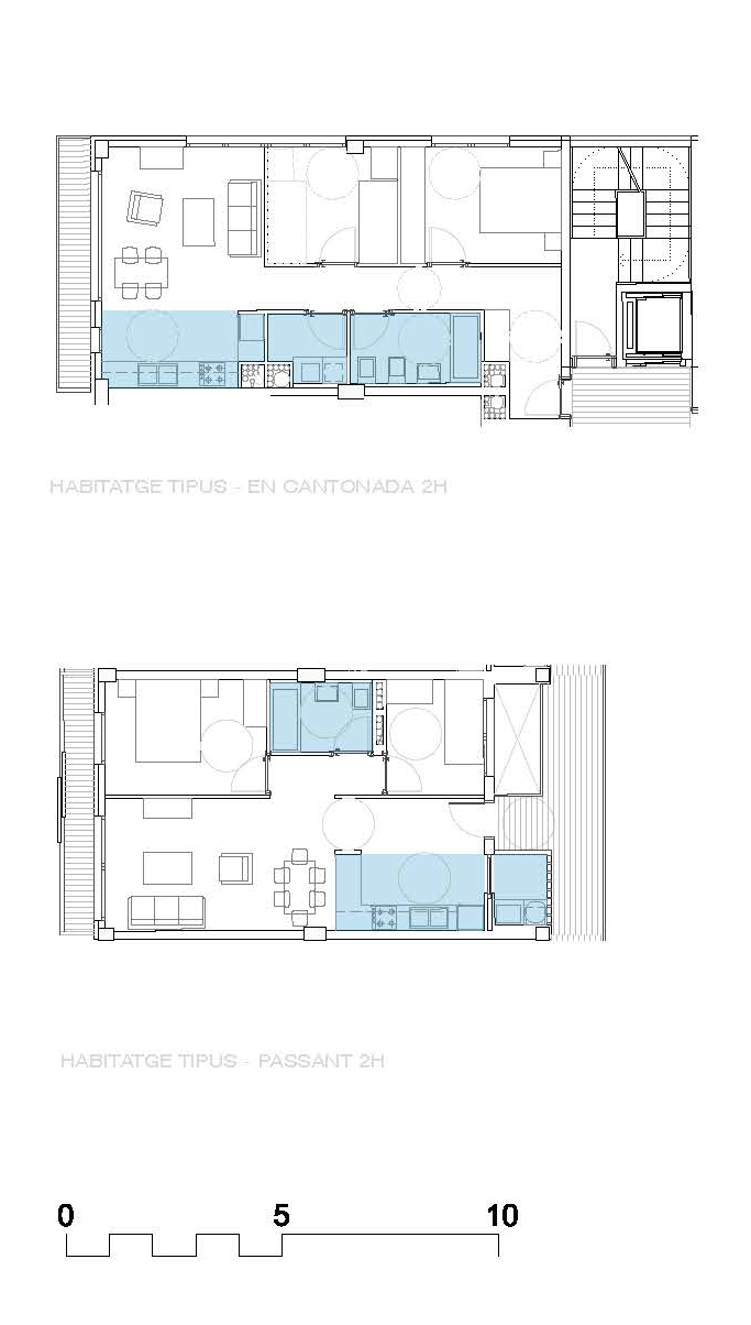 The dwellings: Their flexibility is based on the adaptability of the housings to different uses along the time. This capacity is achieved by arranging the structure in the fixed elements of the building, and to group the services in compact cores inside every.