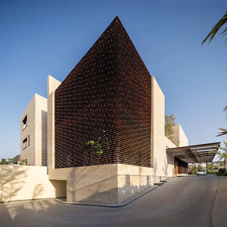 The envelope of the house responded with similar deliberation. A layered assembly of Peterson bricks as the key facade material, air cavities, and insulated blockwork coalesced into a silent system of resistance against heat gain. Planted roofs and perforated jaalis in weathering steel filtered light and dust, while water bodies and skylights choreographed an internal atmosphere that remained cool, luminous, and grounded.