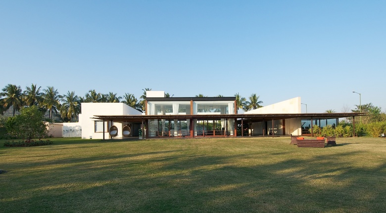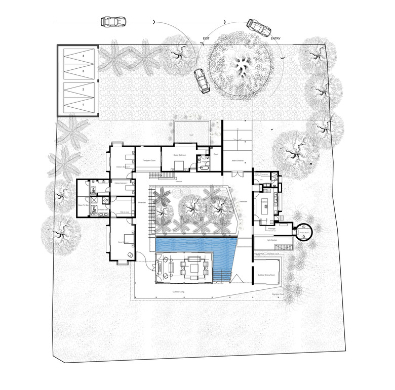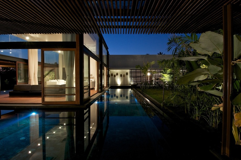 In the vast openness of the surroundings, it made sense to trap a mysterious forest of dense green by stringing the rooms around it, as a Shangri-La against the infinite. This courtyard allows for a private dip in the thicket of the lush vegetation.
