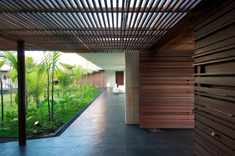 The verandah, with its timber lattice, sets a backdrop that negotiates between the enclosures and the central courtyard. This transitional space op dappled shade promotes a lifestyle in close connection with the outdoors.