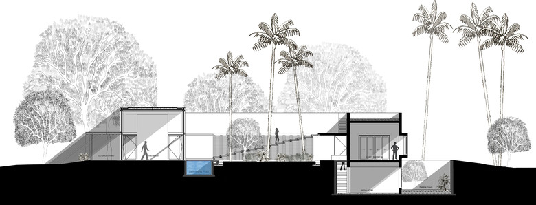 The living room, a counterpoint in the house, is a tall glass box which will throb with the flickering of the fireplace on cold evenings and will frame the changing hues of the sky as the sun sets.