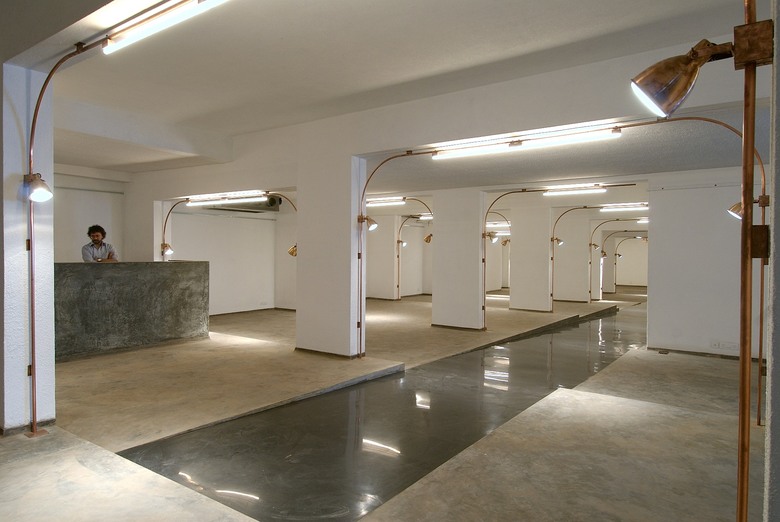 Product lighting and architectural intervention were both generators of this scheme. Since the basement was peppered with columns at regular intervals, the extreme rectangularity of the portals - led to the invention of a superimposed set of portals in the form of arches which served as exposed wire conduits as well as light fixtures for "ambient as well as accent lighting." "Copper" due to its Faradays coil connotation and easy availability in tube format (workability) became the material of choice. These Arches were juxtaposed with the structural portals, creating the repetitive symmetry, converting the dull limited space into infinity.