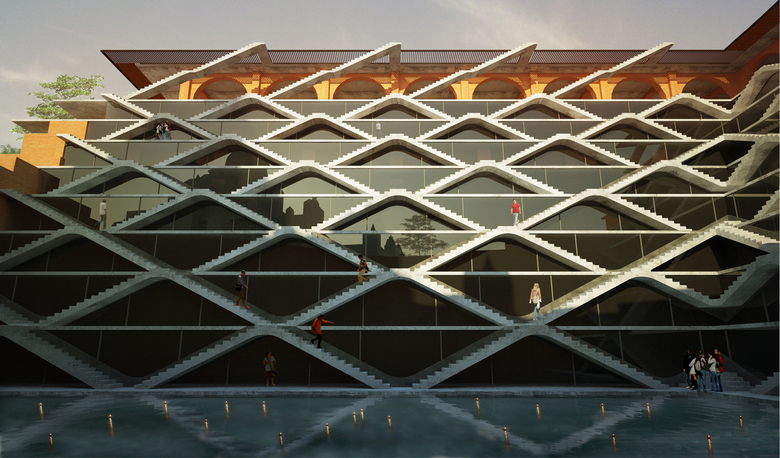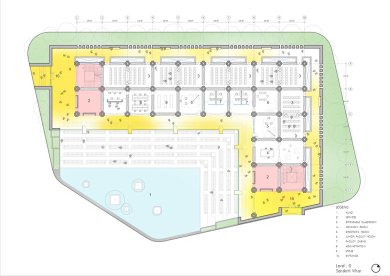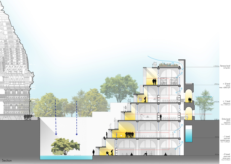 The LIGHT entering through the KUND FAÇADE will be sensed in all its variances at each level, also reflecting off the water contained by the L-shaped Kund. Light will form the central substance of the building invited in, conjured, reflected and even sensed as dark and deep shadows in spaces such as the Asana hall and Shine room. We expect the three dimensional arched arcade structures to reflect and reverberate sound of chants at a pitch and resonance bringing the users closer to the vibrations of the past knowledge they seek to uncover.
