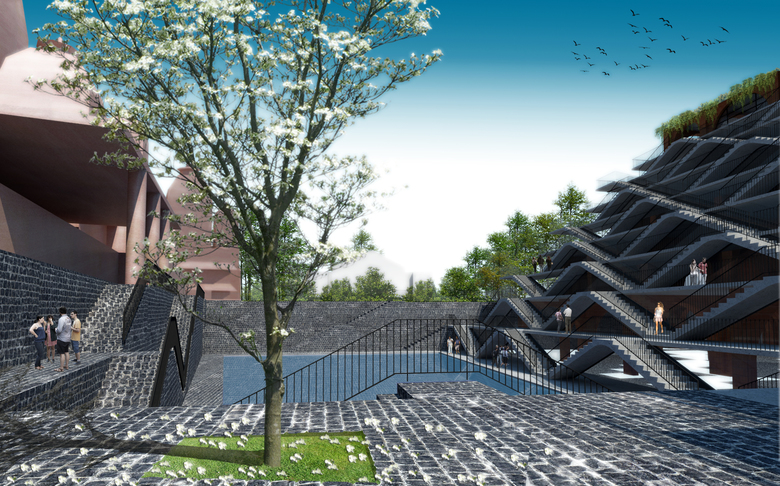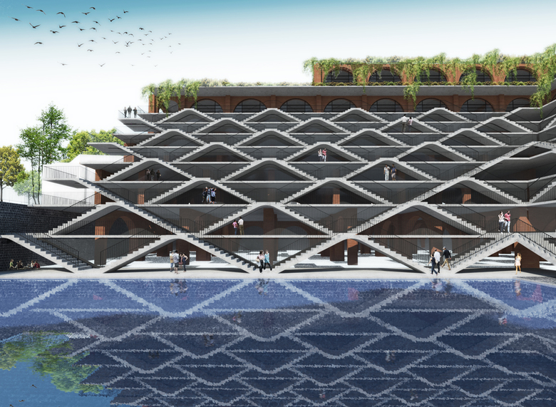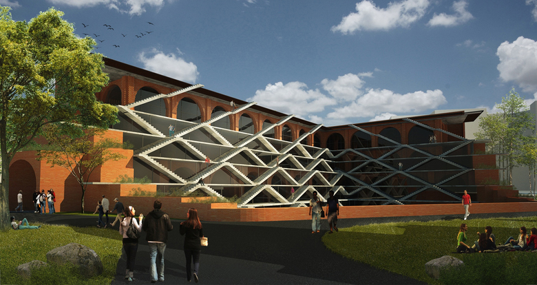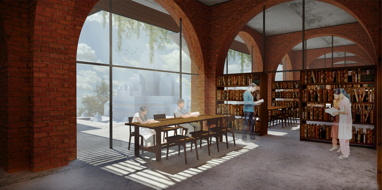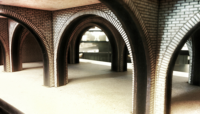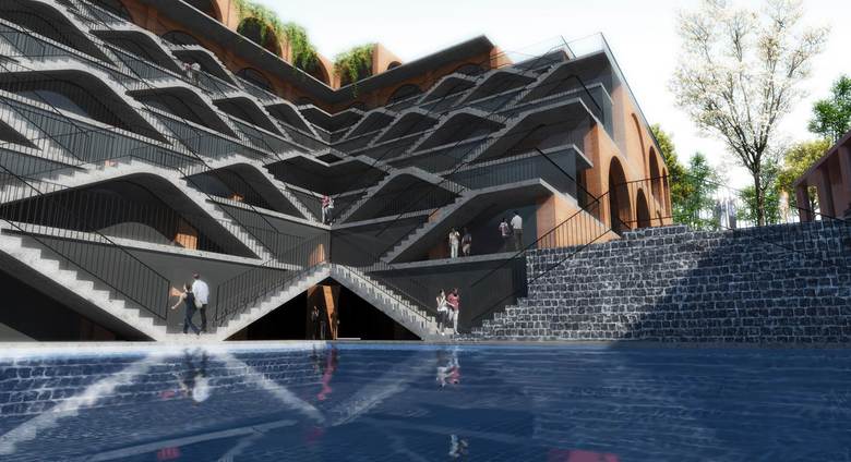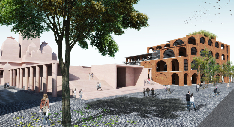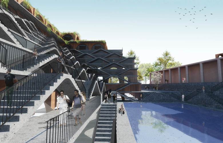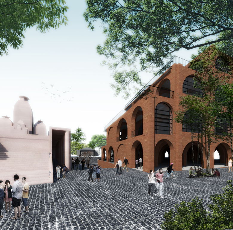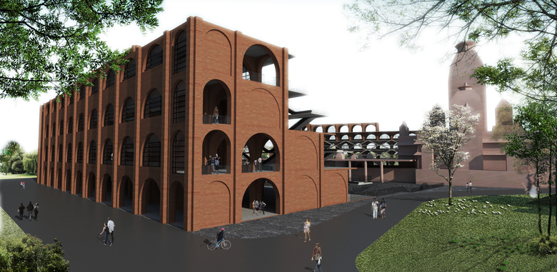 The project is visualized in predominantly two materials – BRICK and CONCRETE.