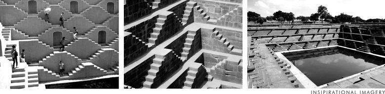 The KUND like construct will harness the RAIN water as a true stepped WELL. Pumped, filtered and used for the service of the students.