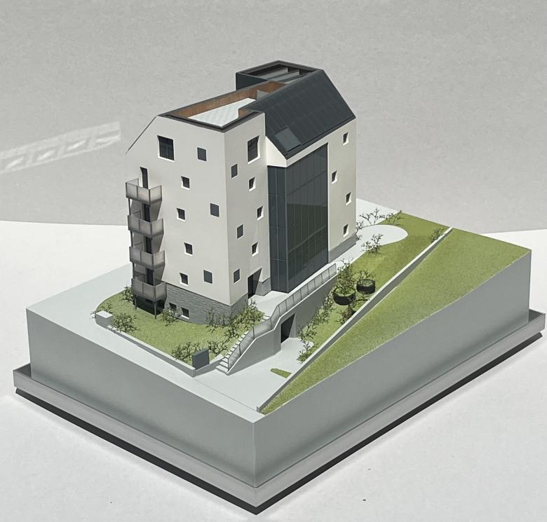 Farbiges Präsentationsmodell M 1:100 aus Kunststoff mit hinterlegten Acrylglasfenstern.