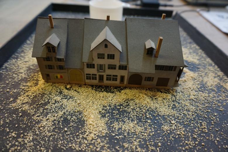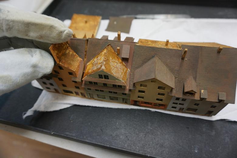 Die sehr detaillierten Gebäude ,welche zum Teil koloriert und mit farbigem Papier beklebt sind erfordern äusserste Sorgfalt bei der Reinigung und beim kleben der losen Teile. Die Reinigung erfolgt durch trockene, mit Granulat aufgetragene Behandlung. Diese entfernt sämtlichen Schmutz und Staub auf den filigranen Oberflächen.