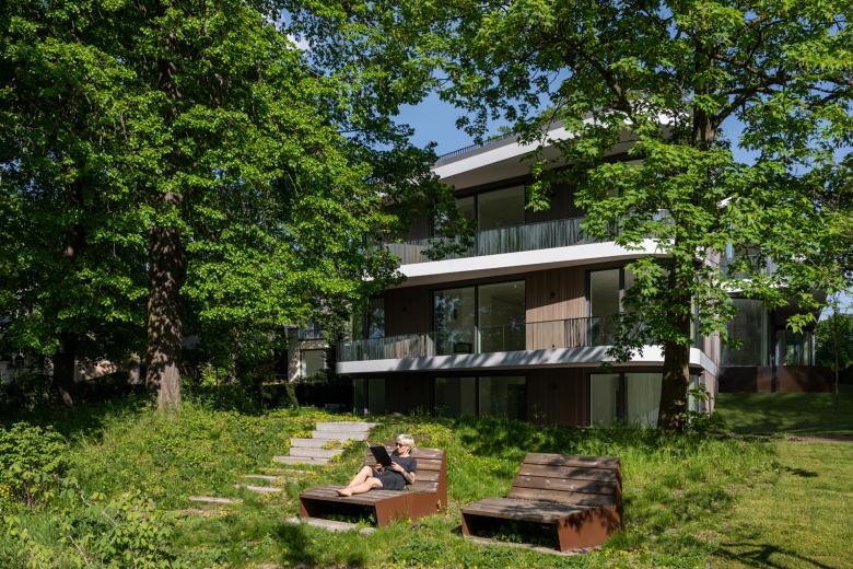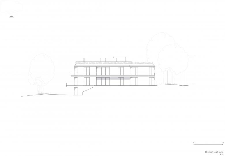 Die Räume im Gartengeschoss erhalten direkten Zugang über eine außenliegende Treppenanlage an der nord-östlichen Gebäudekante. Alle weiteren Wohnbereiche werden über das zentrale Treppenhaus im Haupteingang erschlossen. An die Aufenthaltsräume schließen großzügige Terrassenflächen an. Darüber hinaus ist der größte Teil des Flachdachs der Terrassennutzung vorbehalten, teilweise als Dach mit intensiver Begrünung und teilweise als Holzdeck ausgeführt.