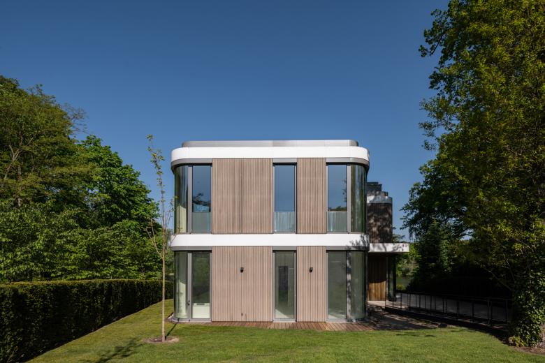 Die hinterlüftete Holzfassade aus Rhombusleisten in lasierter Thermoesche strukturiert die Fassade vertikal. Horizontal wird die Fassade durch weiße, witterungsbeständig beschichtete Metallblechbänder unterteilt. Die ausdrucksvollen Fensterrundungen und ausladenden Balkone akzentuieren die Fassade und Gebäudeform zusätzlich, ermöglichen großzügige Blickbeziehungen auf den Griebnitzsee und holen die umliegende Natur in das Innere des Gebäudes. Öffenbare bodentiefe Aluminium-Blockfenster sorgen für lichtdurchflutete Innenräume. Die Balkone sind ab dem Gartengeschoss mit absturzgesicherten Glasbrüstungen versehen, deren Streifenmuster mit der vertikalen Strukturierung der Holzfassade korrespondiert. Die Süd-, Ost- und Westfassade verfügt über einen motorisch gesteuerten textilen Sonnenschutz als Vertikalmarkise.