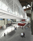 Los niveles superiores de las rampas ofrecen vistas de los tirantes de hierro y de las vigas de madera del techo del edificio original y hacia las galerías en los niveles inferiores. La expansión también incluye auditorios en una excavación subterránea y una librería cerca del techo.
