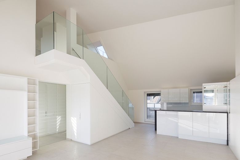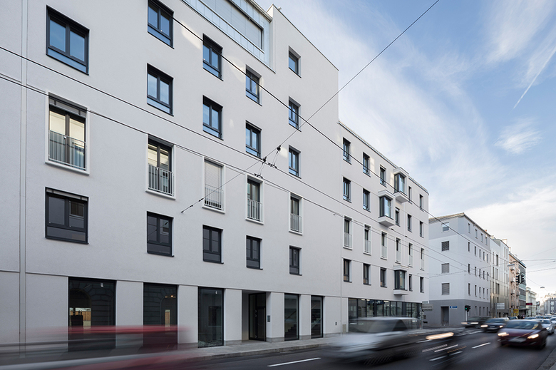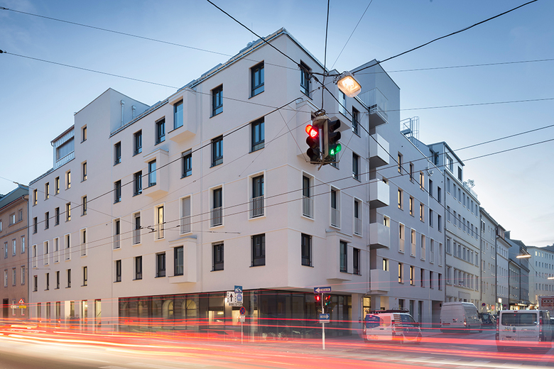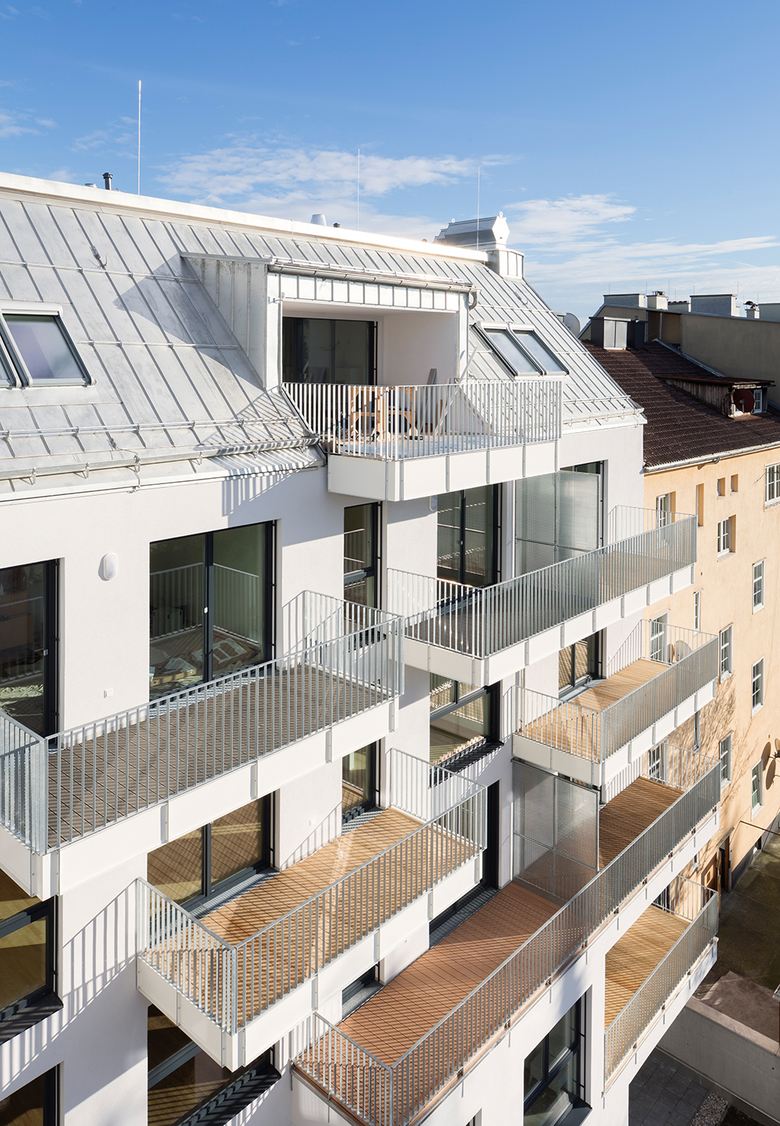 Die Fassadenöffnungen geben den Wohnungen durch außergewöhnlich viel Licht einen hohen Alltagswert und schaffen in der äußeren Erscheinung einen zeitgemäßen Maßstab. Während an den Straßenseiten gerade verlaufende Fassaden die Straßenräume klar definieren, entwickelt sich durch die stark gegliederte Hofseite ein differenziertes System unterschiedlicher privater Freiräume, die sich zum Innenhof hin öffnen. In den einzelnen Geschossen laufen versetzte Balkonflächen über die gesamte Gebäudebreite und erzeugen ein Wechselspiel aus Enge und Weite, Privatheit und Offenheit. Erschlossen werden sie durch raumhohe Fenstertüren, wodurch sich die Belichtungssituation der Wohnungen wesentlich verbessert.