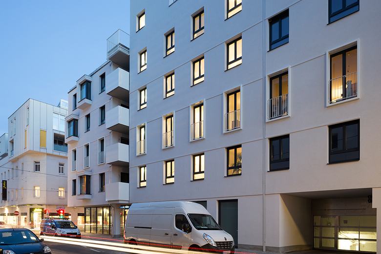 In den übrigen Geschossen werden die Parapete auf Sitzhöhe konzipiert, um auch hier die Interaktion zwischen öffentlichem und privatem Raum zu fördern. Alle straßenseitigen Öffnungen sind in den Obergeschossen als doppelflügelige Fenster oder Fenstertüren ausgeführt. Damit wird ein funktionelles Optimum erreicht: Fenster, die bei geöffnetem Zustand nur unwesentlich in den Raum ragen und leicht zu reinigen sind.