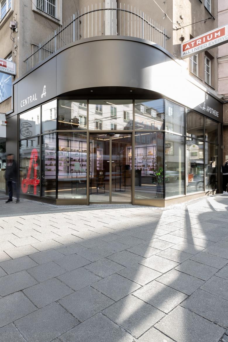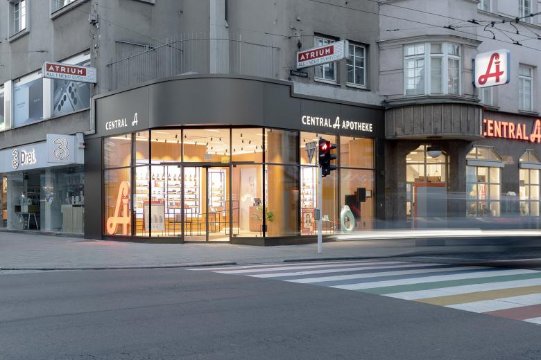 Die Ecke Landstraße/Mozartstraße ist die meistfrequentierte Kreuzung Oberösterreichs. Nachdem das Ecklokal frei wurde, hat die benachbarte Apothekerfamilie die Chance genutzt, ihre Apotheke zur Mozartkreuzung hin zu erweitern.