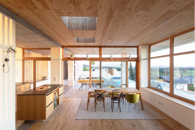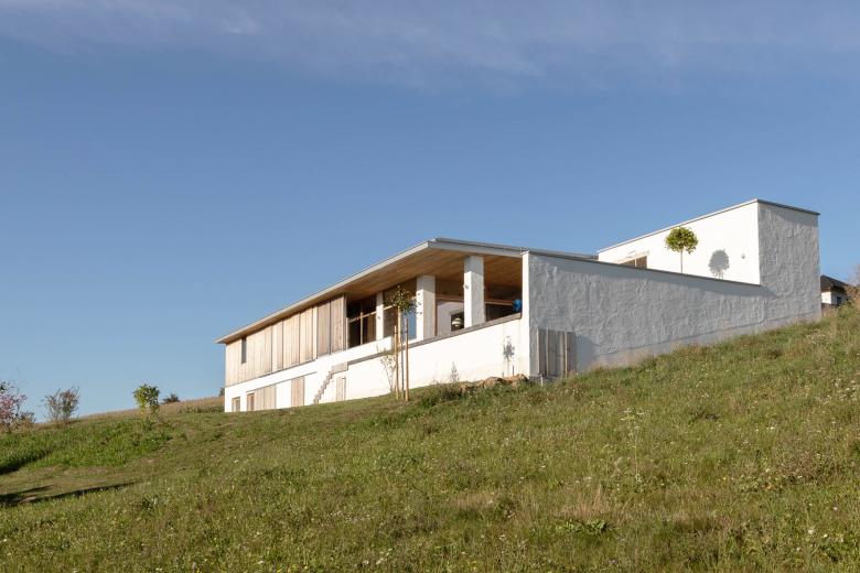 Die innere Raumabfolge entwickelt sich an einer Art Magistrale, wobei diese langestreckte Erschließungszone, gleichzeitig das Rückgrat der nach Süden orientierten Wohn,- und Lebensbereiche bildet. Von der Garage bis zum geschützten Außenbereich werden alle Raumfunktionen über diese interne Wegeachse erschlossen; - durch die Küche gelangt man direkt auf die geschützte Freiterrasse, die einen ungestörten Blick in die Landschaft freigibt.