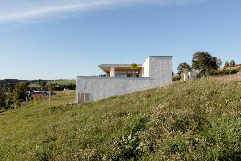 Ein 35 Meter langes Einfamilienhaus, sitzt an der nördlichen Grundgrenze und öffnet sich dem Hangverlauf folgend, Richtung Süden. Die schlanke Figur des Baukörpers begründet sich zum einen aus der Grundstücksform und zum anderen aus der Orientierung nach den Himmelsrichtungen – so entwickelt sich eine klare Linie unter der Vielzahl der umliegenden Bebauungsstrukturen.
