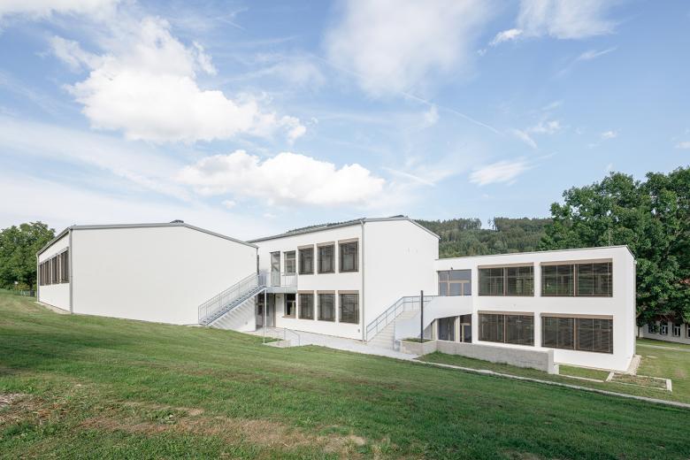 Im Laufe der Zeit wurde durch Umbauten und Erweiterungen ein Satteldach auf den Bestand aufgesetzt, sodass die Oberlichten im Stiegenbereich (für die Belichtung des Aula- und Pausenbereiches) verschlossen wurden, - dieses Satteldach wurde nun abgetragen und das Fensterband wieder geöffnet.