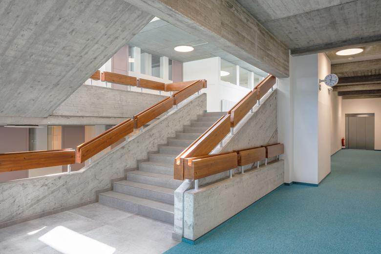 Die bestehende Schule lebt von ihre Materialqualität, denn das Spiel zwischen Holz, Glas, Beton und Teppichböden ist harmonisch inszeniert.