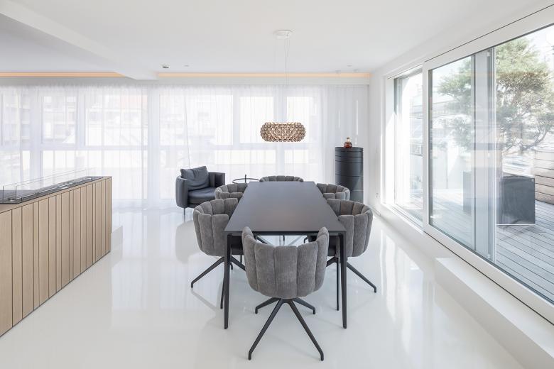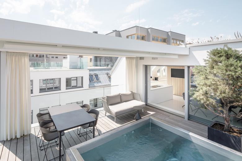 Im Sinne des geltenden Bebauungsplanes wurde jedoch auf eine "einheitliche, durchgehende" Aufstockung (wie bei einem Blockrand) verzichtet und eine differenzierte Höhenentwicklung ausgebildet. Durch diese gestaffelte Dachlandschaft entstehen für die Wohnungen in den Dachgeschossen zugeordnete und geschützte Terrassen. Auf Vorsprünge oder Balkone wird wie im Bestand verzichtet, - die Wohnungen erhalten jedoch eingeschnittene Loggien und großzügige Dachflächenfenster, die Penthouse-Wohnung ein innenliegendes Atrium.