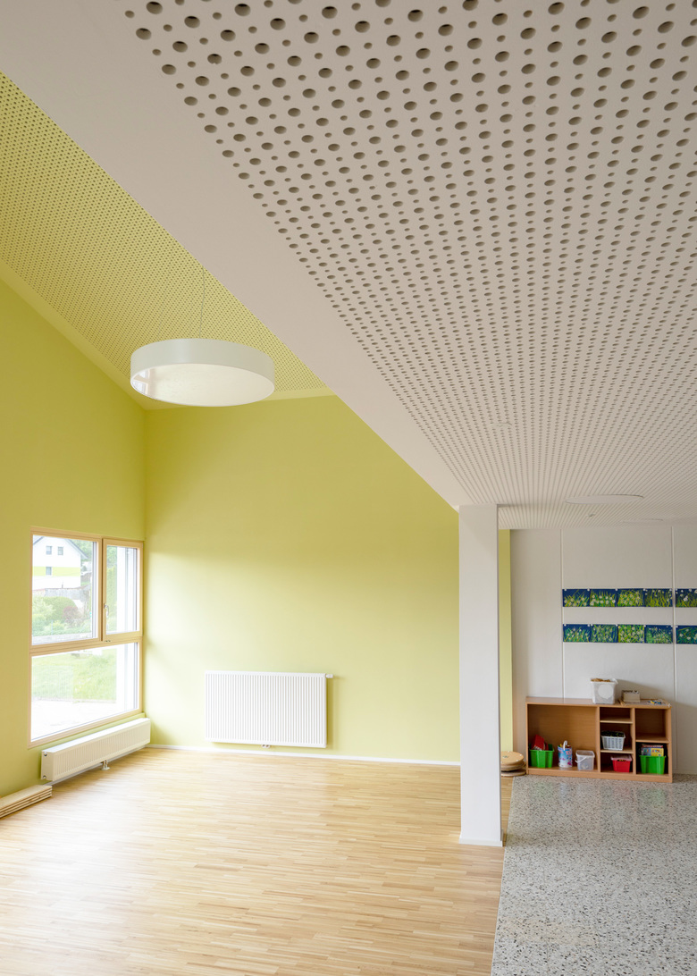 Die Klassenräume bilden die äußere Schicht, in der Mitte liegen die Neben- und Nassräume, während sich zu den Glasfronten an der Stirnseite die freien Bereiche für den Pausenaufenthalt orientieren. Im Obergeschoß öffnet sich der neu errichtete Bereich bis unter die Dachsilhouette und bildet durch seine farbliche Gestaltung eine optisch abgetrennte Lernlandschaft mit großzügigen Luftraum. - "Alle Klassenräume münden direkt in die Marktplätze!" - der untere Gruppenraum lässt sich darüber hinaus mit seiner großzügigen Verglasungen direkt mit den Freibereich verbinden.