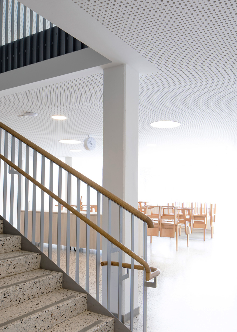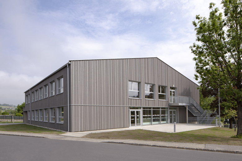 Die bestehende und durch Vor- und Rücksprünge gekennzeichnete Baukörpergliederung konnte durch die notwendigen räumlichen Erweiterungen in einer neuen und schlichten Gebäudehülle zusammengefasst werden. Ohne großer Gestik verbindet sich nun das Zusammenspiel von Alt und Neu und bildet durch die vorgehängte Holzfassade eine ruhige aber selbstbewusste Gebäudehülle.