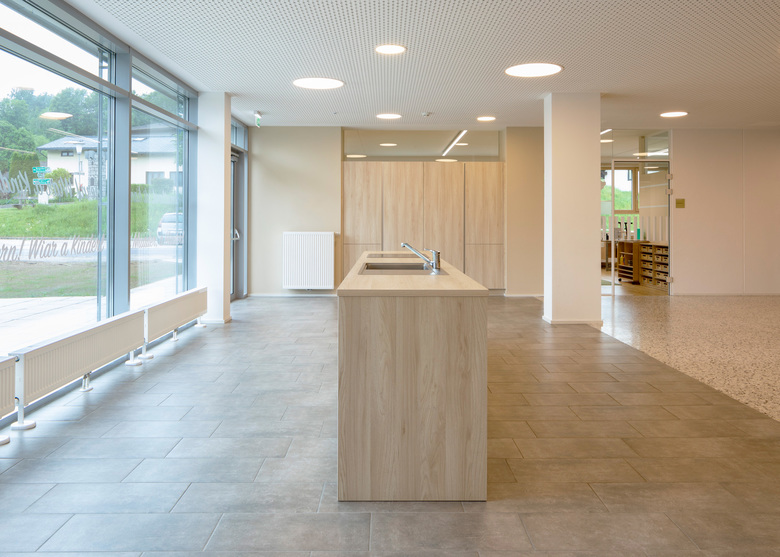 In dem neu geschaffenen Verbindungstrakt zwischen Turnsaal und Volksschule wurde neben der Garderobe auch die neue Eingangssituation angeordnet. Diese Verlagerung des Einganges ermöglicht es, dass nun auch der Turnsaal von der Volksschule aus behindertengerecht erschlossen werden kann. Ein weiterer Vorteil dieser Neustrukturierung liegt darin, dass die zuvor geschlossene Stirnseite mit großzügigen Verglasungen geöffnet werden konnte, um viel Tageslicht in die "Marktplätze" zu bringen.