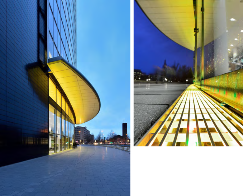 Now Düsseldorf’s largest office block is even more striking. When the continuous façade drainage guttering and the linear grating on top of it were both replaced as part of its forecourt refurbishments the opportunity arose for integrating dramatic lighting. As with the guttering and the grating, the lighting was supplied by TTC Technology/ADO Lights. The LED wall washer outdoor lighting is integrated into the façade guttering over a length of 38 meters. The lights shine upwards, thus dramatically accentuating the building’s entrance area – meaning that the porch is elegantly illuminated from below – in the exact colors of the company’s corporate design, with the warm yellow hues creating an inviting atmosphere and providing visitors with a clear point of reference.