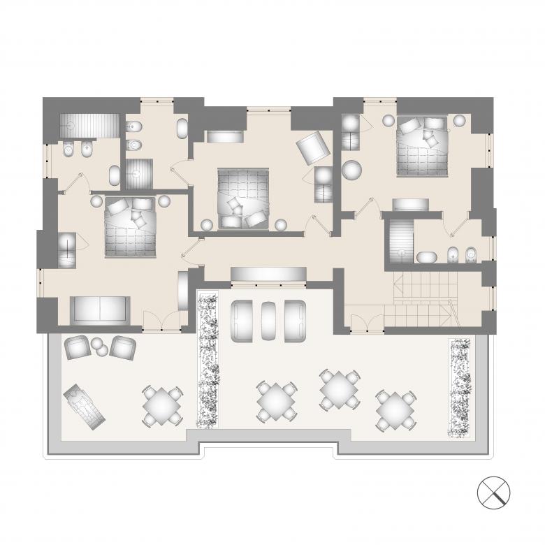 Since the original floors and interior finishes could not be recovered, a neutral "container" was created, with warm grey-toned slab flooring and walls in similar hues, enriched with low panelling and breathable plaster boiserie, as well as doors and windows in matte white enamel.