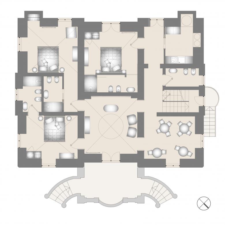 The interior layout was also rethought with the goal of keeping the original architectural configuration visible and usable. The six guest rooms and their en-suite bathrooms were created through targeted interventions. Auxiliary spaces were carved out by inserting new partitions in a clearly recognisable way, ensuring that the legibility of the existing spaces, especially on the ground floor with its vaulted ceilings, remained intact.