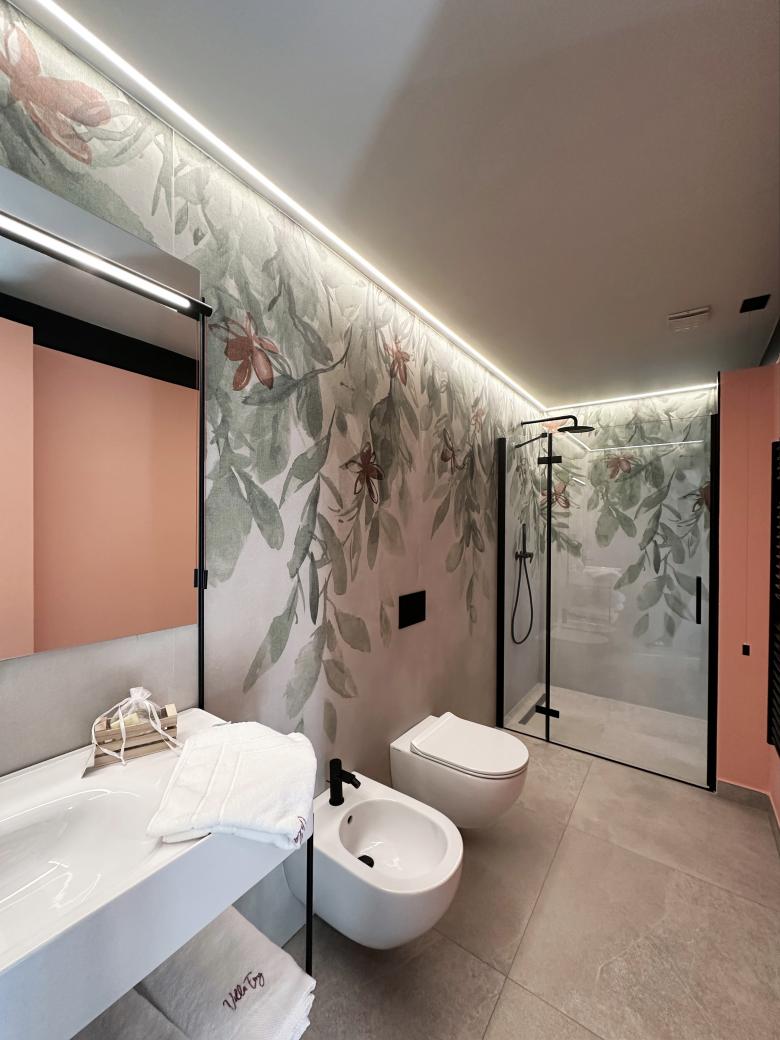 In the bathrooms, next to the neutral tone of the stone-effect flooring, chromatic and decorative elements emerge: matte black taps and metal profiles offer a graphic counterpoint to floral designs. The Deco spirit of the era — a specific request from the client — has been reinterpreted through the use of varied, modern floral patterns.